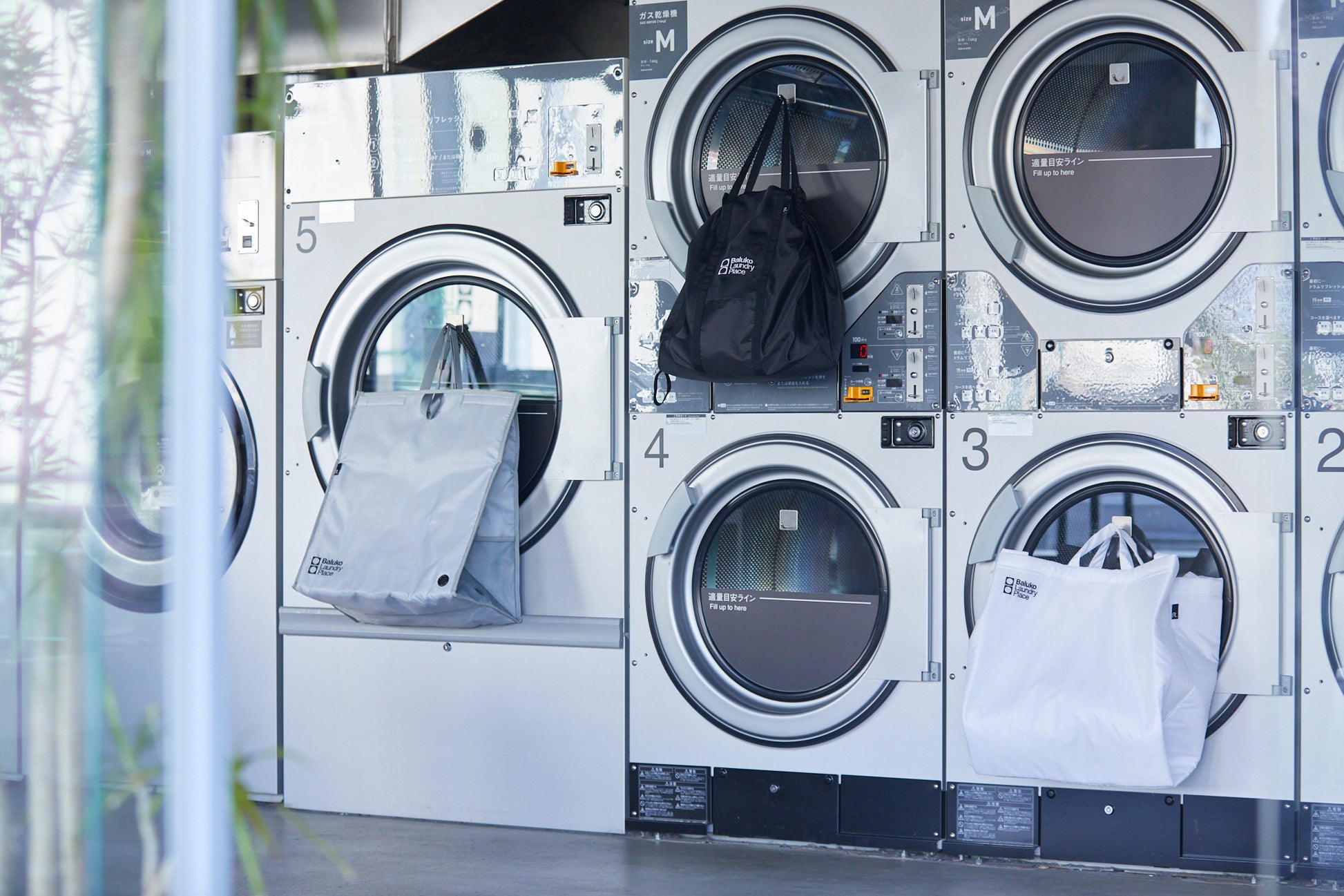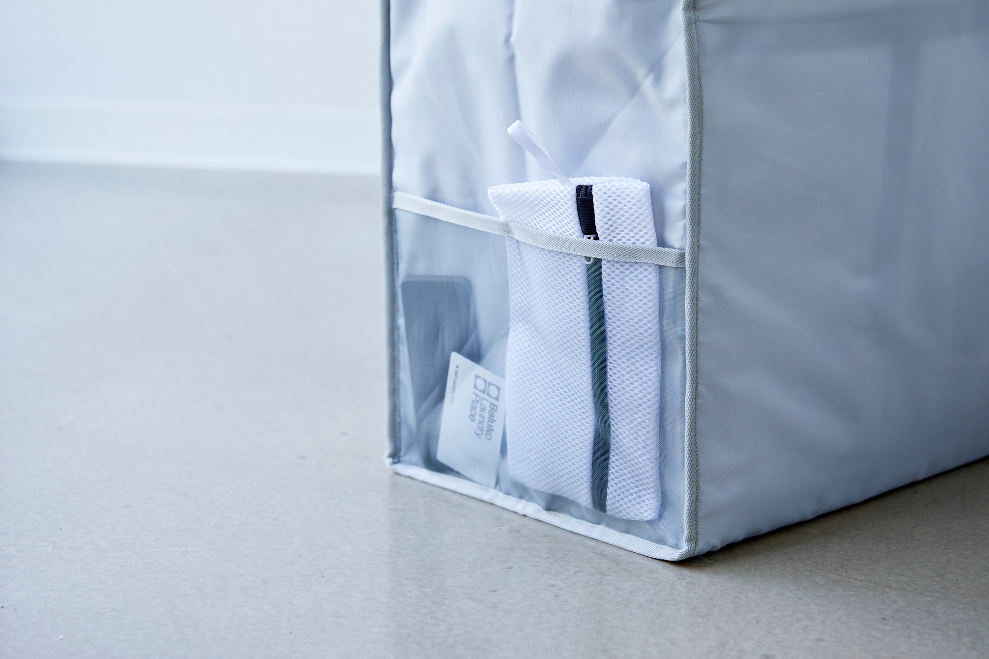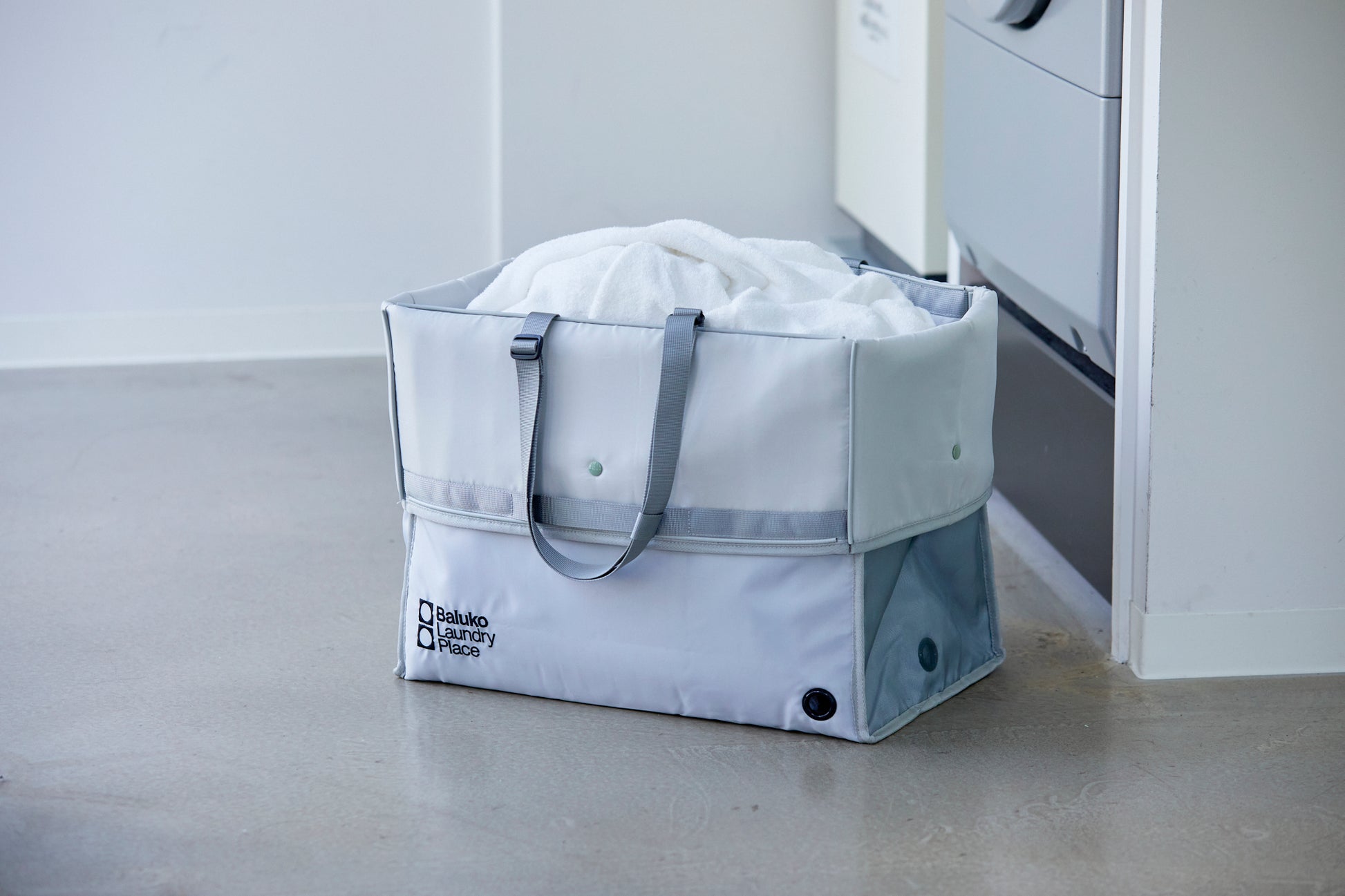 〈コンテナ〉は大容量の自立型トートバッグ。洗濯乾燥機Mサイズ(約70リットル)の適量が入ります。ハリのある生地と四角の支柱により安定した形状を保ち、しっかりと自立します。ご家庭ではランドリーボックスとして使用し、いっぱいになったらそのままランドリーに持ち運ぶことができます。