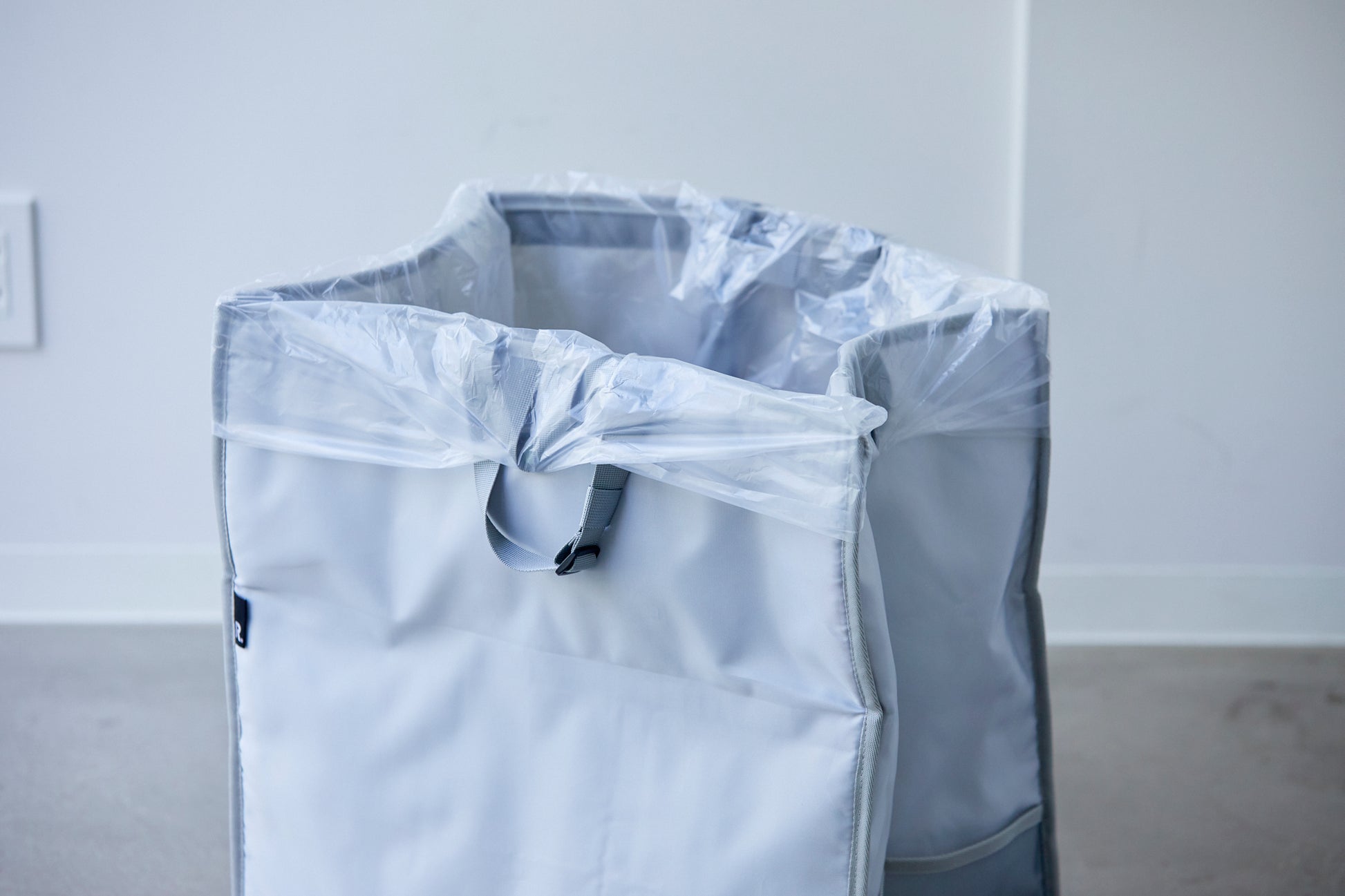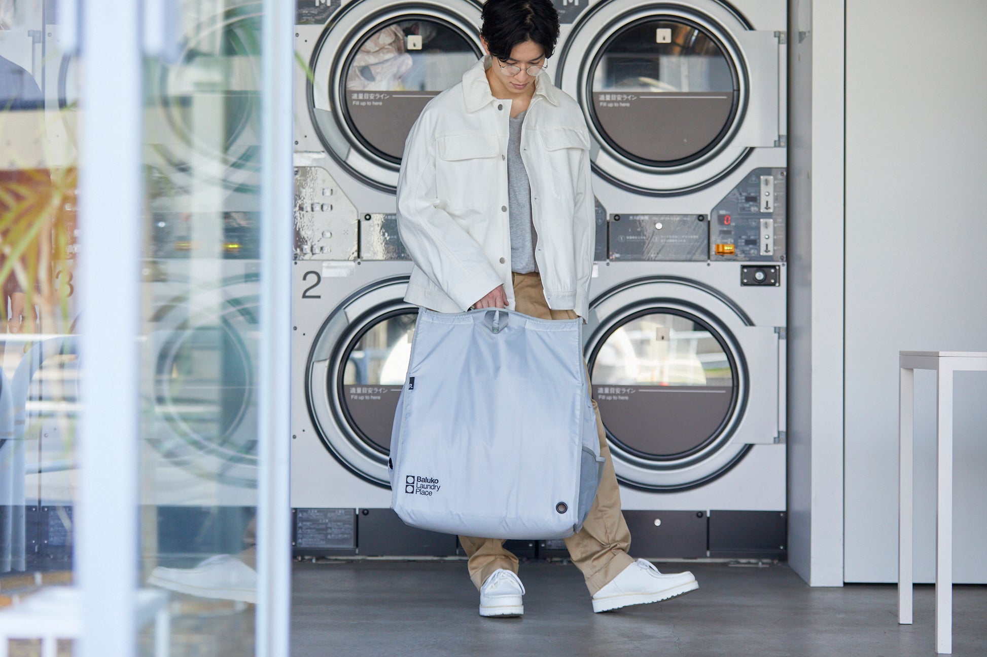 外側に折ってハーフサイズでも使える仕様。湿ったものをいれることが多いランドリーならではのシチュエーションにも配慮し、バッグの下部への通気穴を配置。ルートートのアイデンティティであるルーポケットもメッシュ素材となっています。内側に70リットルサイズのポリ袋を取り付けることができるので、直接バッグに触れさせたくないものや水気を多く含んだものでも気にせず入れることができます。色はBaluko Laundry Placeの店内をイメージしたライトグレーを採用。明るすぎず暗すぎずシックでスタイリッシュなカラーとなっています。