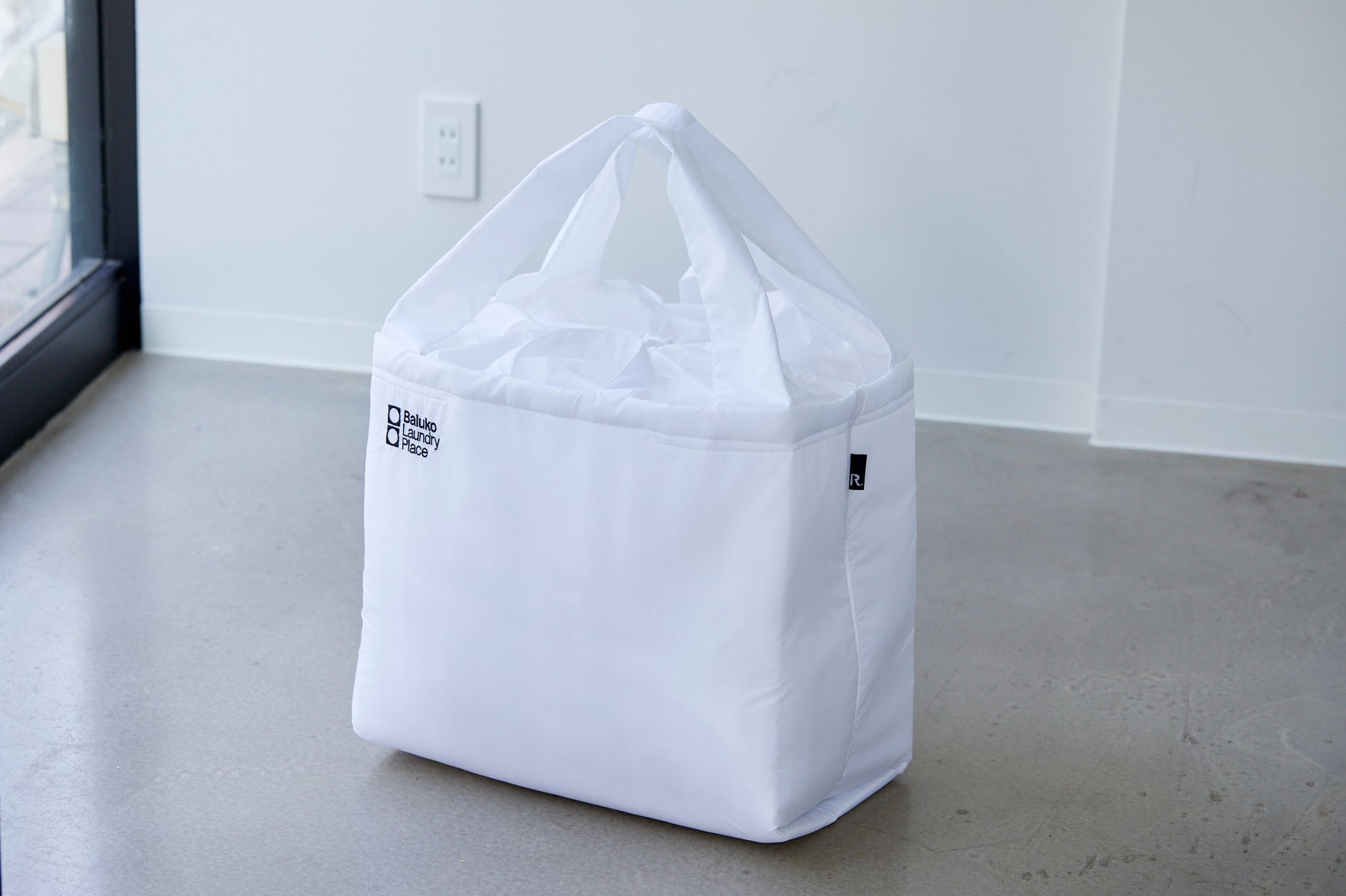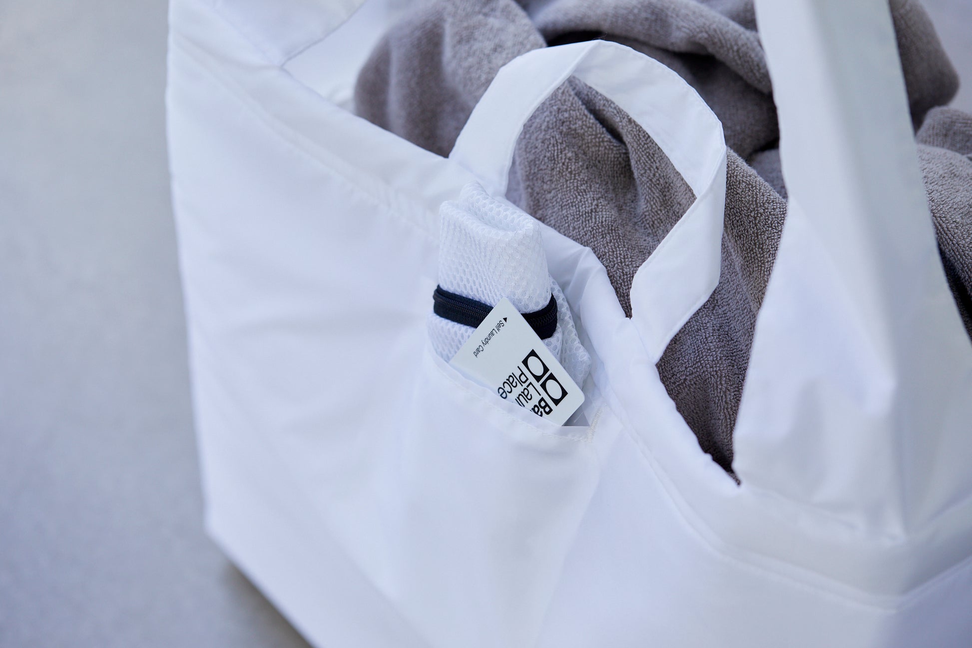 手持ちでも肩掛けでも使えるダブルハンドル仕様の2Wayなので、ランドリーバッグとしてだけでなく、日常のあらゆるシーンで活躍します。持ち歩きしながら出し入れしやすい位置に、スマホなどの収納に便利なルーポケットが付いています。色はBaluko Laundry Placeのキーカラーのホワイトを採用しています。